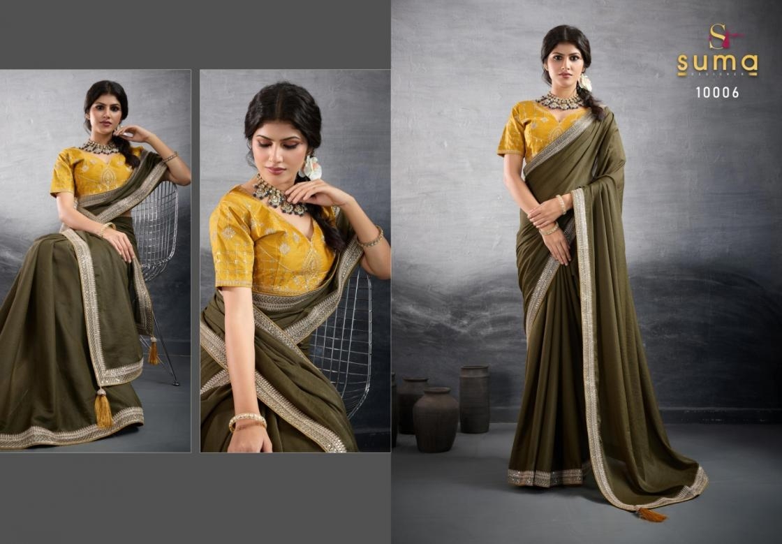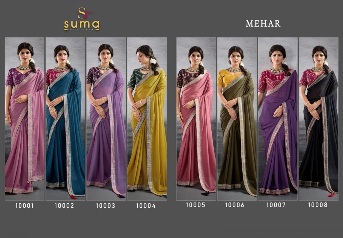 | Other Details: | 🩵 Wrapped in Tradition, draped in Elegance 🩵 BRAND NAME – SUMA DESIGNER 🩷 CATALOG NAME _ MEHAR 🩵 Series :– 10001 To 10008 Fabric :- Star Georgette With Heavy Border Rate :– 985/- PER PCS Only☘️ GST 5% EXTRA FIND YOUR PERFECT VIBRANT SAREE TODAY 🩷 |