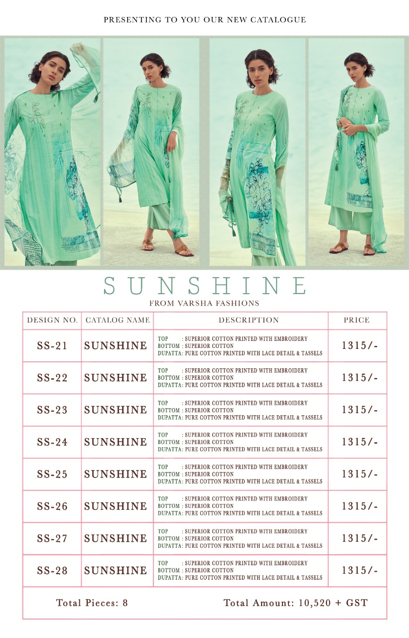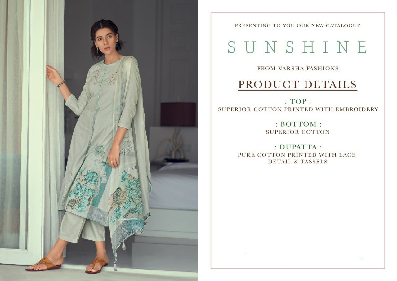 | Other Details: | Presenting to you our new catalogue. Sunshine From Varshaa LUXURY COTTON Top – Superior lawn With Embroidery & Digital Prints Bot – Superior Cotton Printed . Dup – Pure Cotton Printed With lace details & Tassels Rate:- 1315/- 1 Set:- 08pcs. |