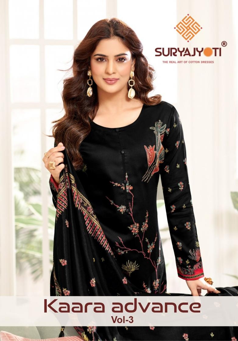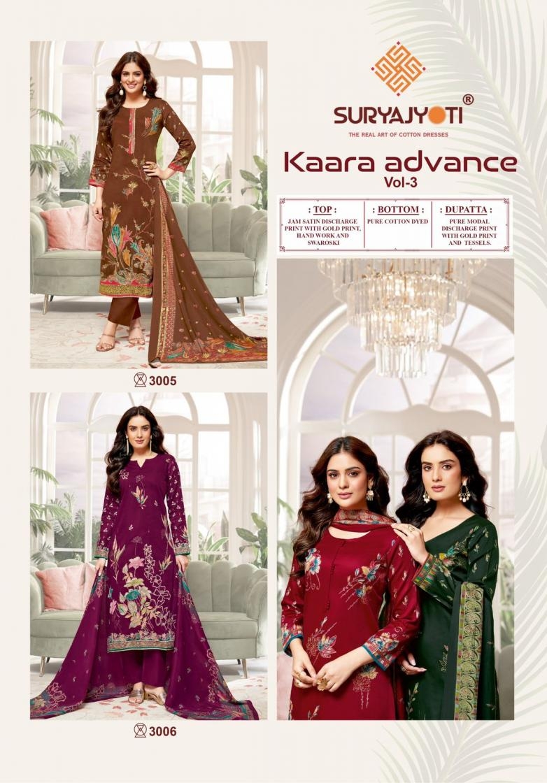 Other Details: | 👫DEAR CUSTOMER👫 🙏WELCOME TO SURYAJYOTI 😍LAUNCHING OF SURYAJYOTI’S NEW FANCY PRINT CATALOG 📕CATALOGUE- KAARA ADVANCE VOL-3 👚TOP- JAAM SATIN DISCHARGE PRINT WITH FULL HANDWORK,SWAROVSKI AND BORDER GOLD PRINT 👖BOTTOM- PURE COTTON 🧣DUPATTA- PURE MODAL DISCHARGE PRINT WITH GOLD PRINT & TESSELS CUT- 👚2.50-👖2.50–🧣2.25 💸RATE- 815/ 💼PACKING- EXCLUSIVE POUCH PACK WITH BAG Always with you...👍 |
