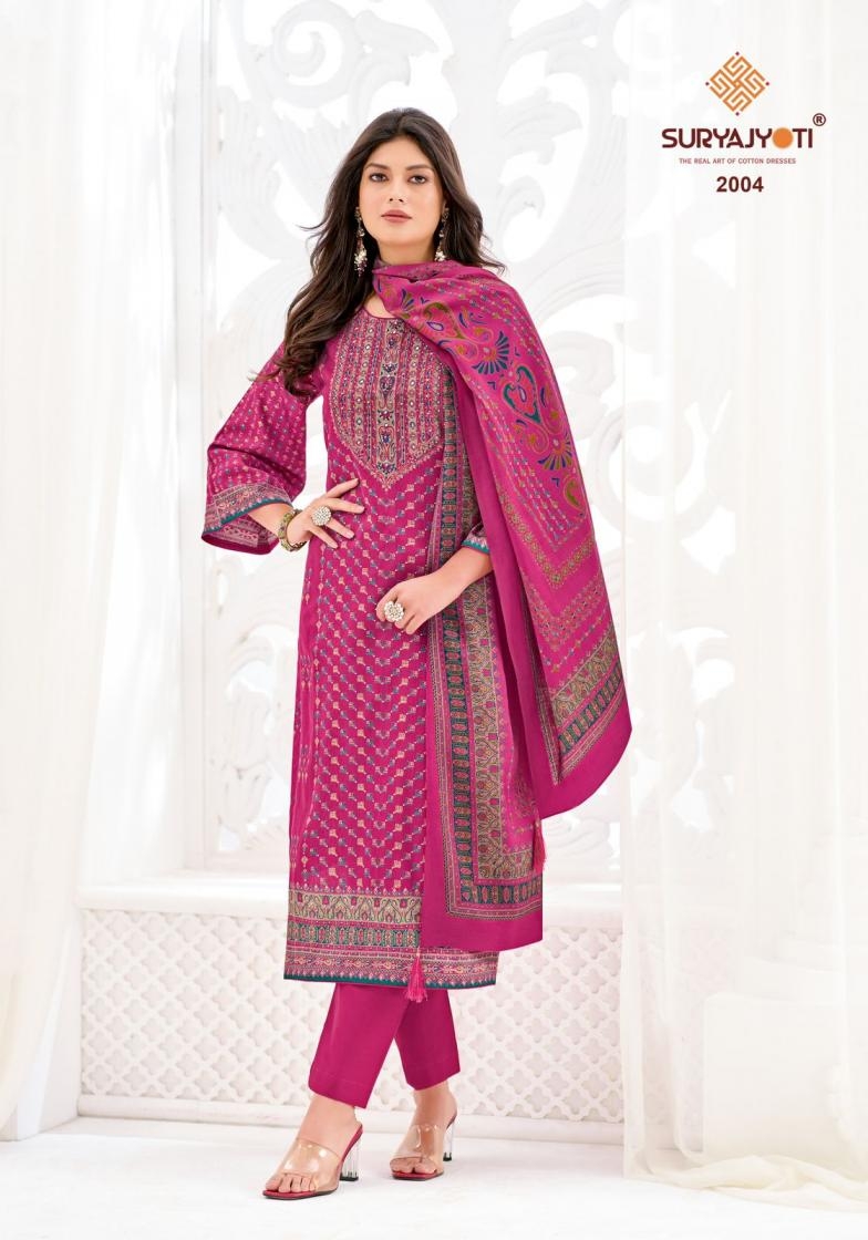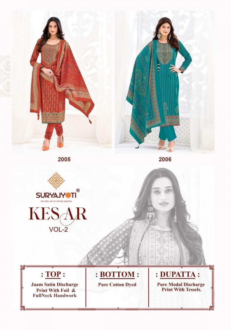 | Other Details: | 👫DEAR CUSTOMER👫 🙏WELCOME TO SURYAJYOTI 😍LAUNCHING OF SURYAJYOTI’S NEW FANCY PRINT CATALOG 📕CATALOGUE- KESAR VOL-2 👚TOP- JAAM SATIN DISCHARGE PRINT WITH FOIL AND FULL NECK HANDWORK 👖BOTTOM- PURE COTTON 🧣DUPATTA- PURE MODAL SILK DISCHARGE PRINT CUT- 👚2.50-👖2.50–🧣2.25 💸RATE- 861/- +gst 💼PACKING- EXCLUSIVE POUCH PACK WITH BAG |