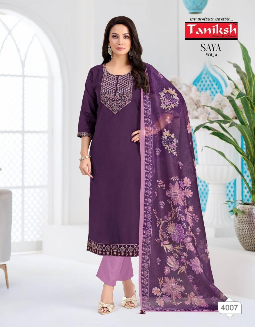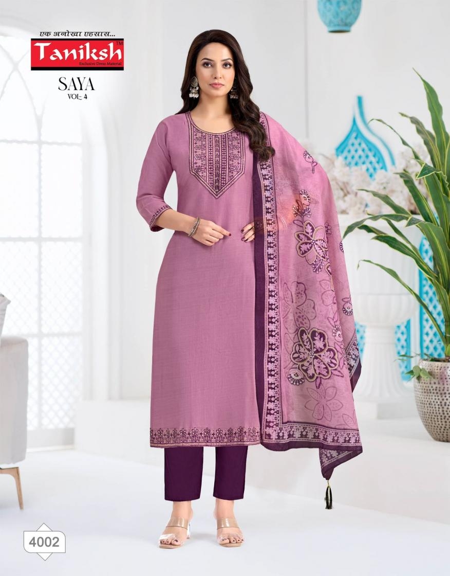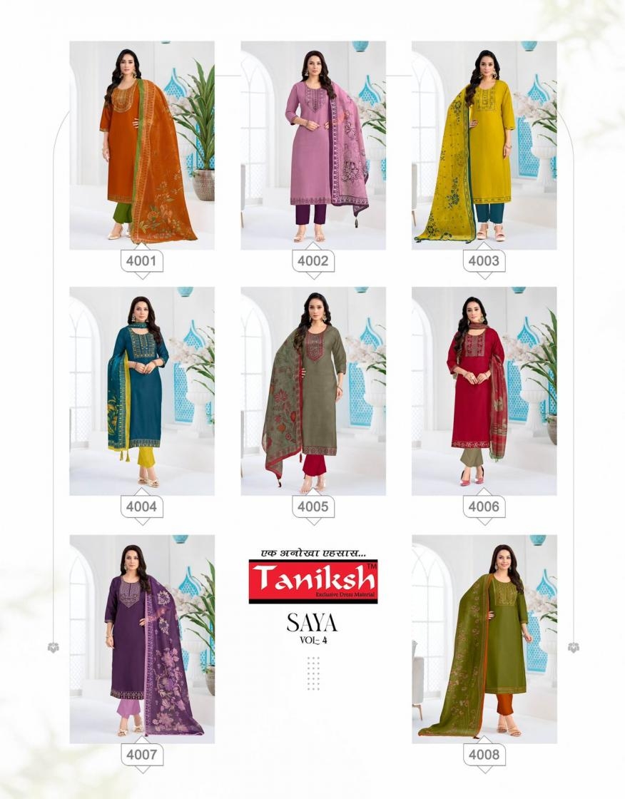 | Name: | Taniksh Saya Vol 4 Series 4001-4008 Vertical Print Readymade Suit | |