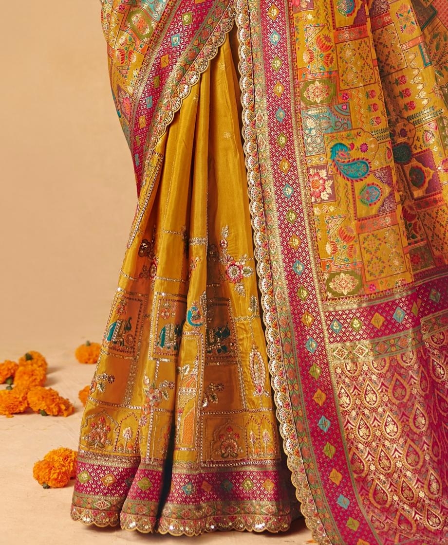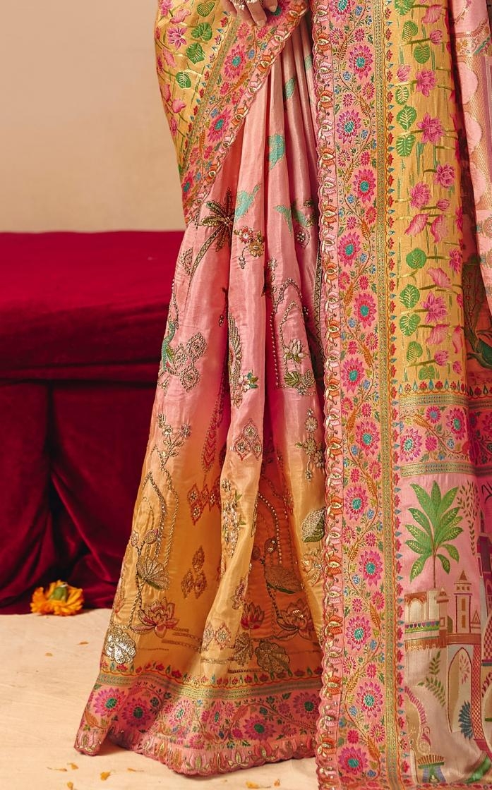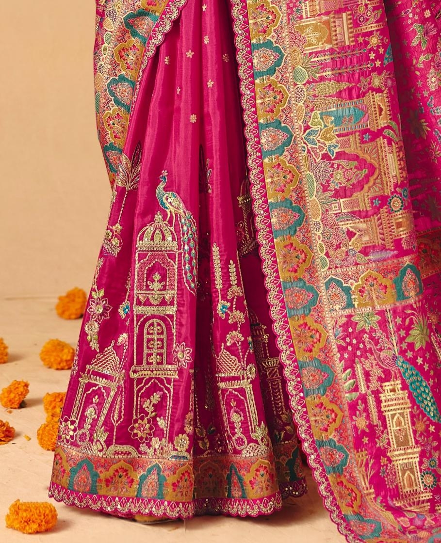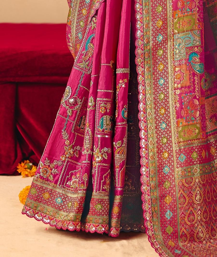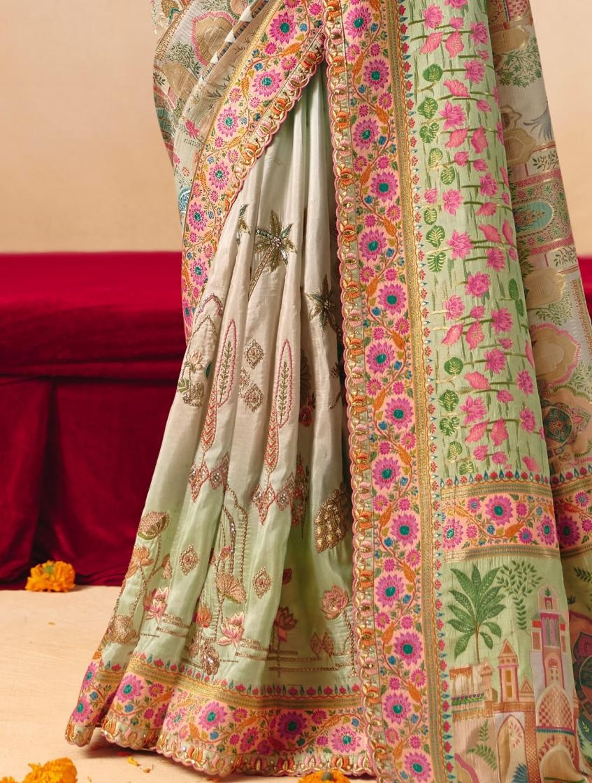 Saree Fabric :Dola Zari Silk SareeWith Heavy Emboidery Thread Work On Patli And Cutwork Lace