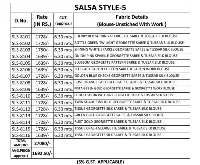 | Name: | Tfh Salsa Style Vol 5 Series 8101 To 81116 Georgette Silk Traditional Saree In Wholesale Surat |