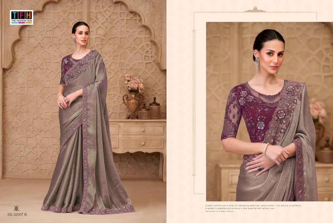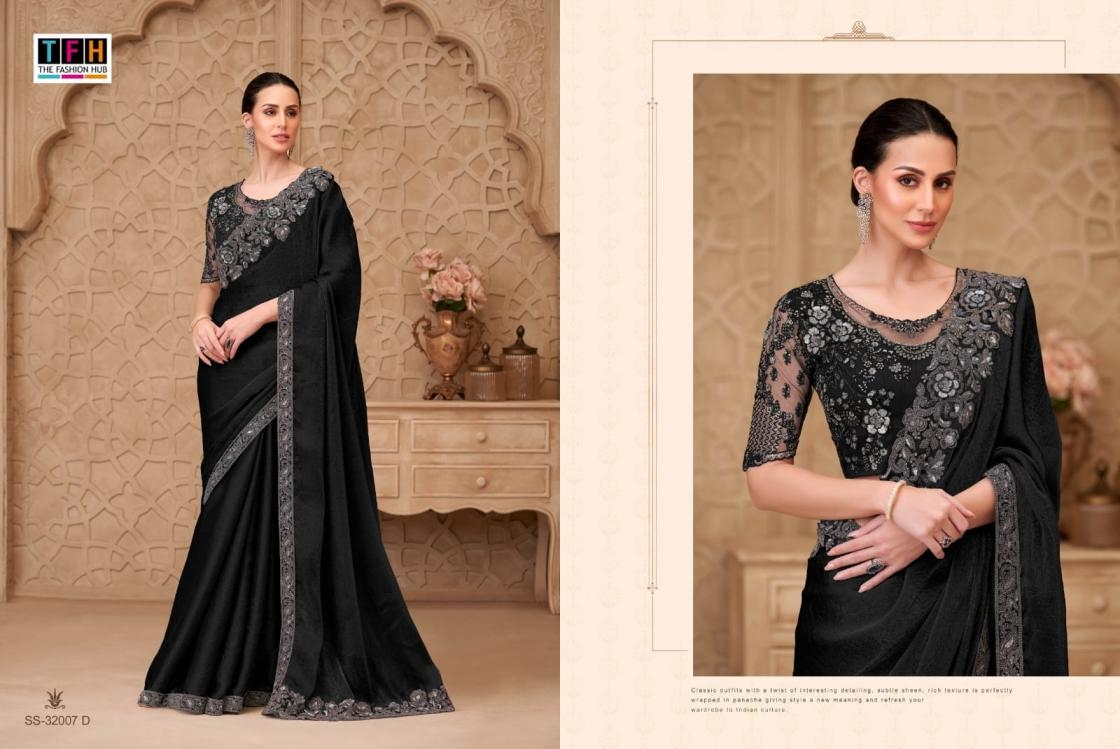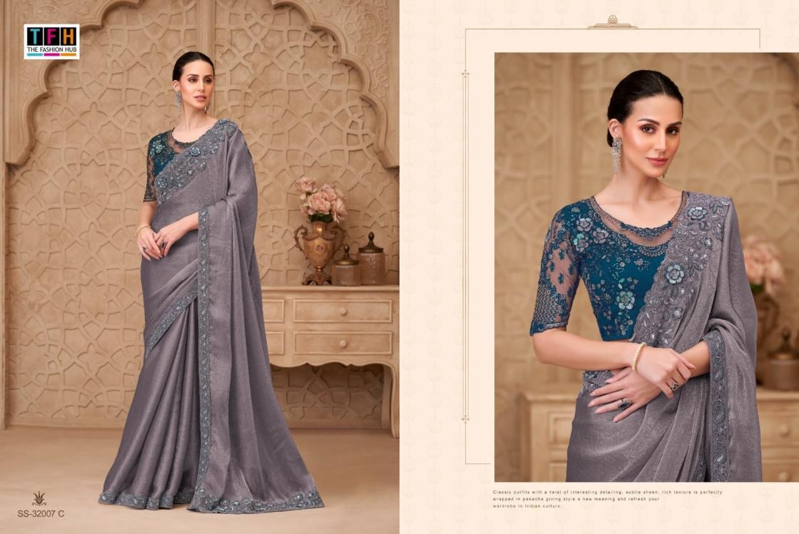 | Name: | Tfh Silver Screen 320007 Series Sartin Crush Georgette Wholesale Saree |