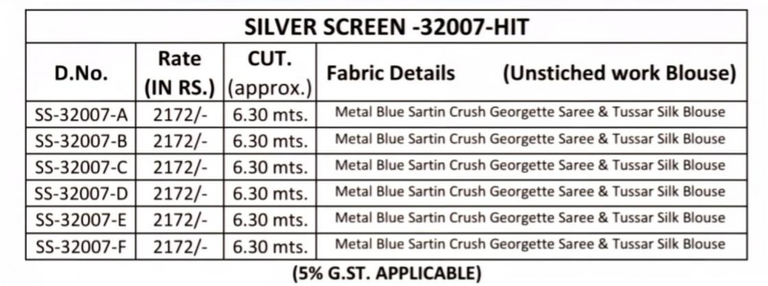 | Other Details: | Brand Name : Tfh Catalogue Name: Silver Screen 320007 Series Hit Color Series :320007 Hit Colour Price : List Attached+5%GST Fabric : Fabric List Attached 5% Gst Occasion : Festival wear, Carnival Wear, Party Wear |