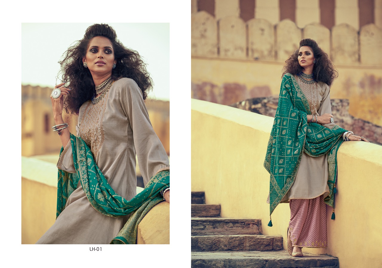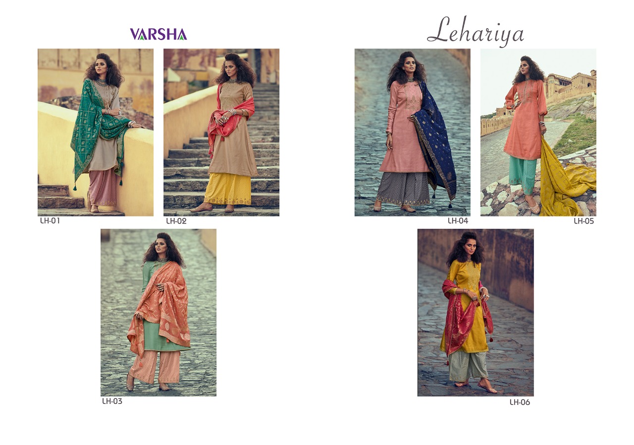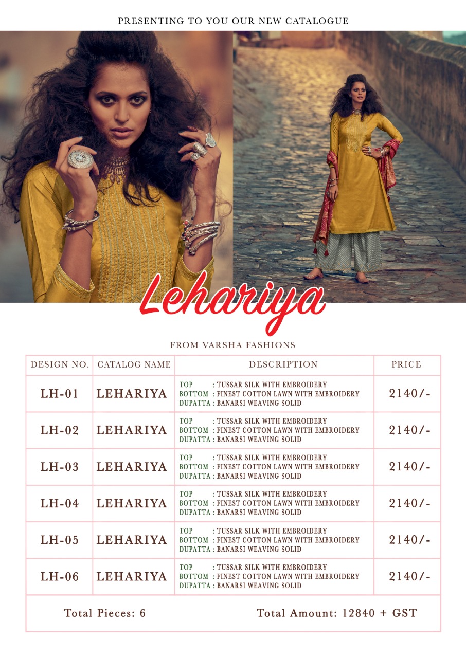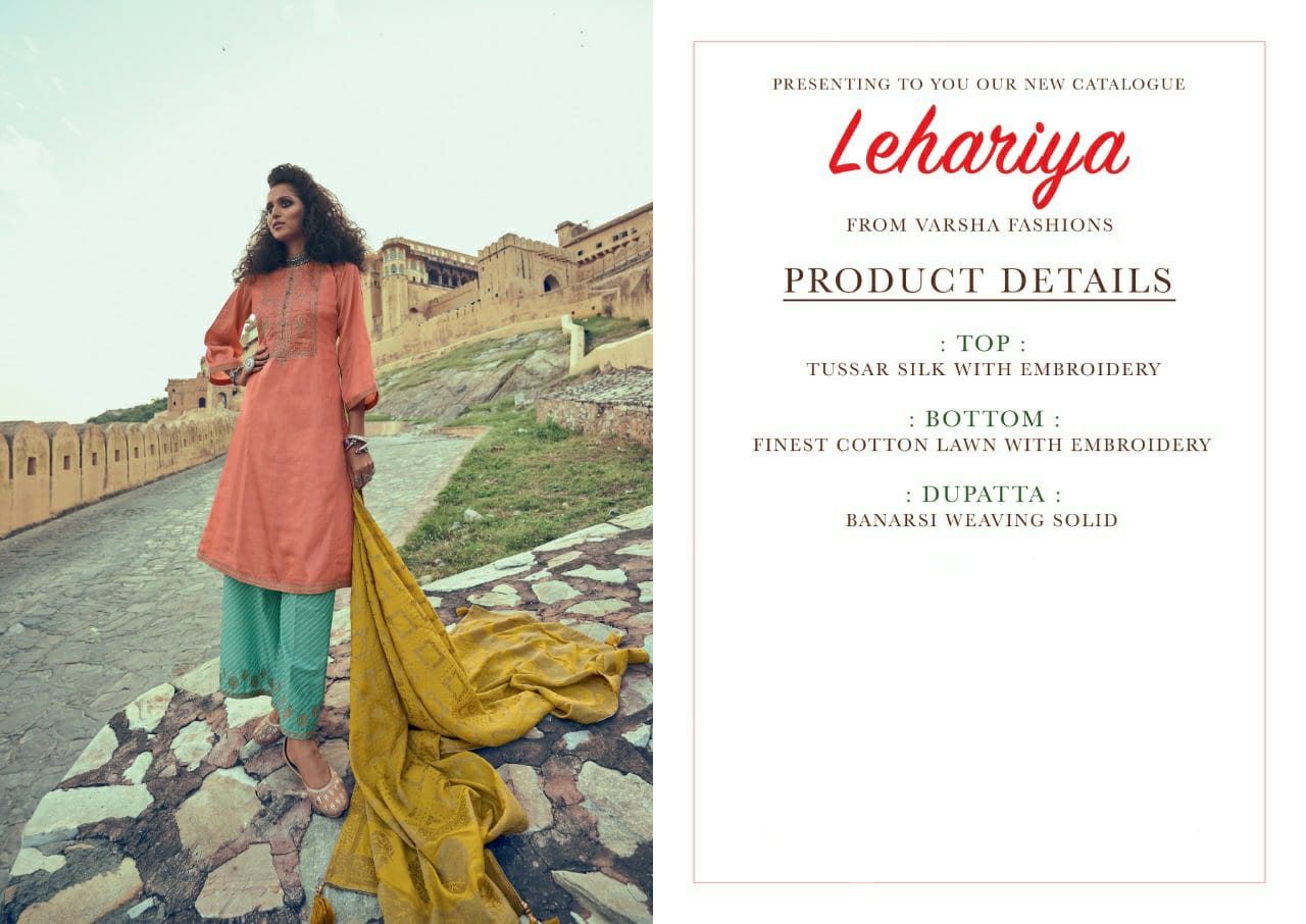 | Other Details: | Presenting to you our new catalogue. LEHARIYA From – Varsha Top -Pure Tussar Silk With Designer Embroidery Bot – Finest Lawn With Embroidery Dup – Pure Banarasi Weaving Solid Rate:- 2140/- 1 Set:- 06 pcs. |