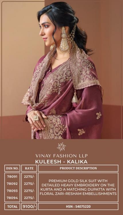 | Name: | Vinay Fashion Kuleesh Kalika Series 78091-78094 Gold Silk Wholesale Suit | |