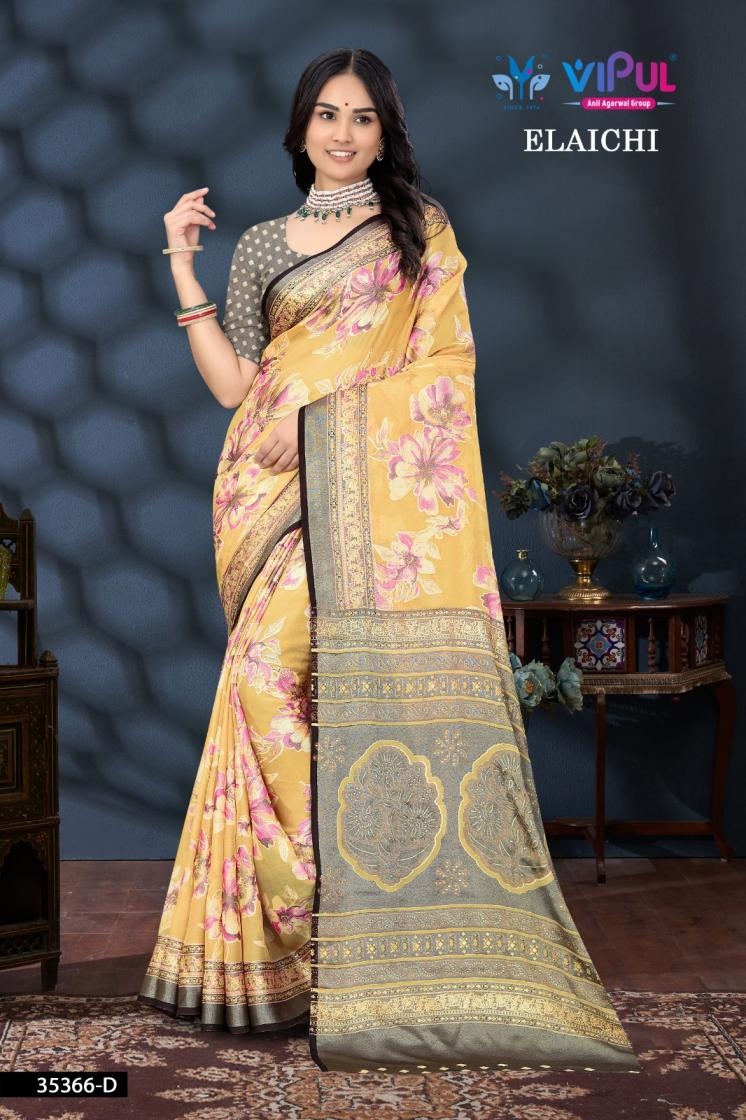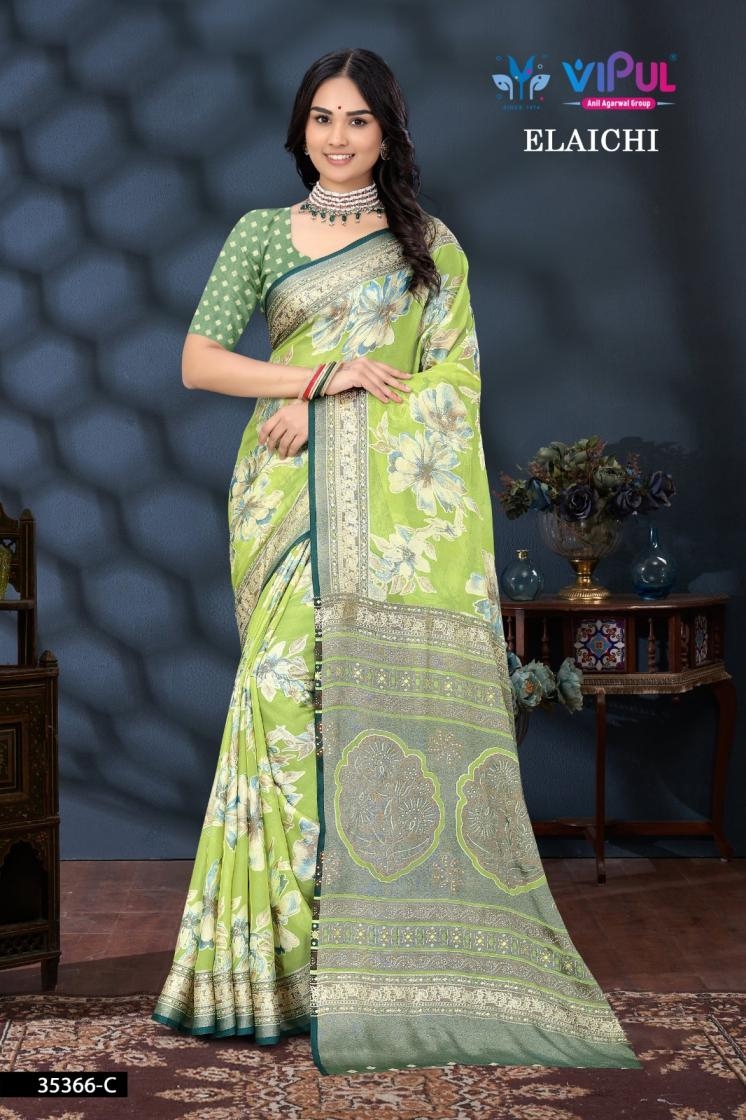 | Other Details: | Brand _ Vipul saree ELAICHI 35366 colour's FABRIC ' BRASSO RATE : 995/- per pcs GST EXTRA Set & loose & single |