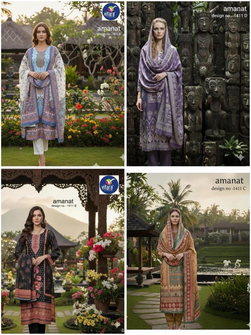 | Name: | Vitara Fashion Amanat Series 1411a To 1411d Muslin Weaving Jacquard Fully Stitch Pakistani Combo Suit In Wholesale Surat |