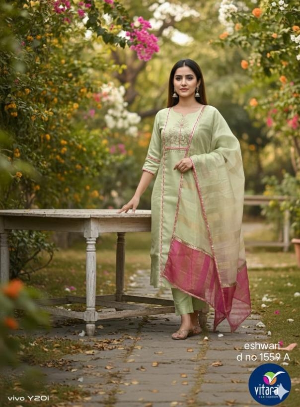 | Name: | Vitara Fashion Eshwari 1559 Viscose Tissue Wholesale Readymade Suit |