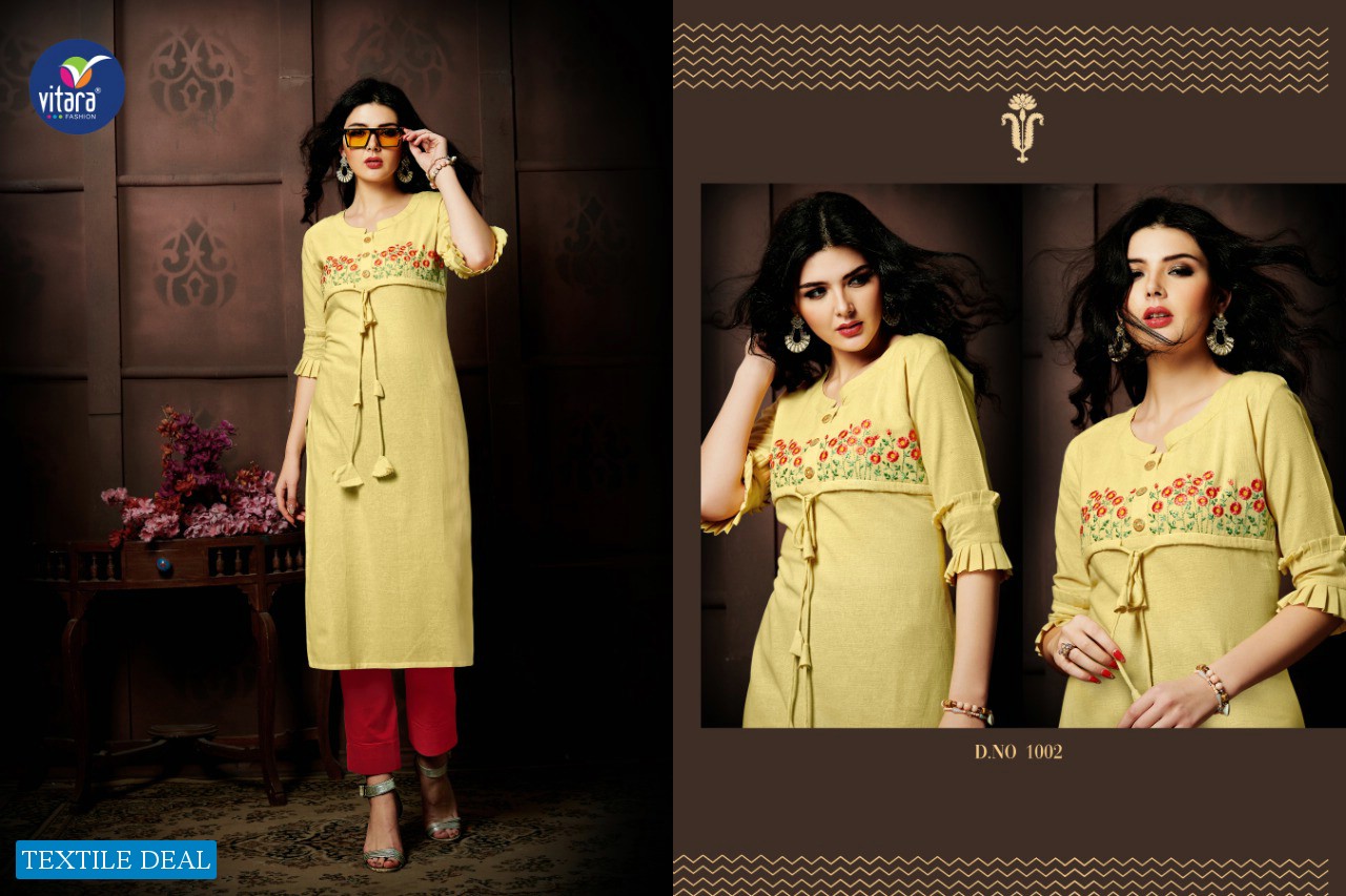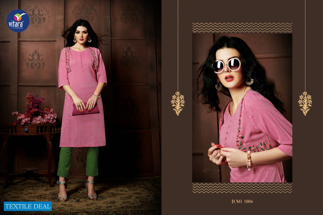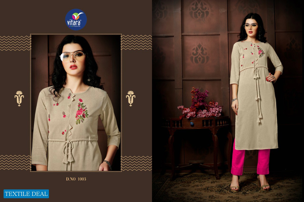 | Other Details: | ? vitara fashion launches exclusive designer kurti ? ?Catalogue name- SIMRAN ?Fabric- khadi handloom ?Size – M -38 ,L-40,XL-42,xxl-44 ☣Designs- 5 ?Rate:- 425/- GST +5% ADD ON BILL AMT |