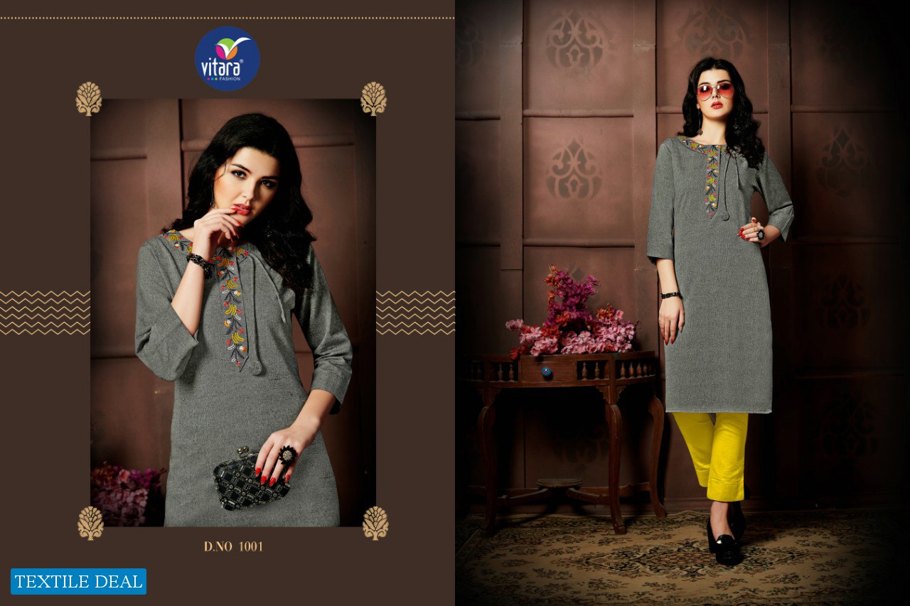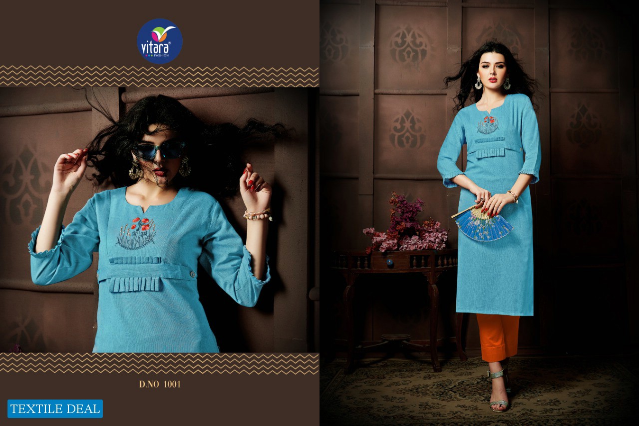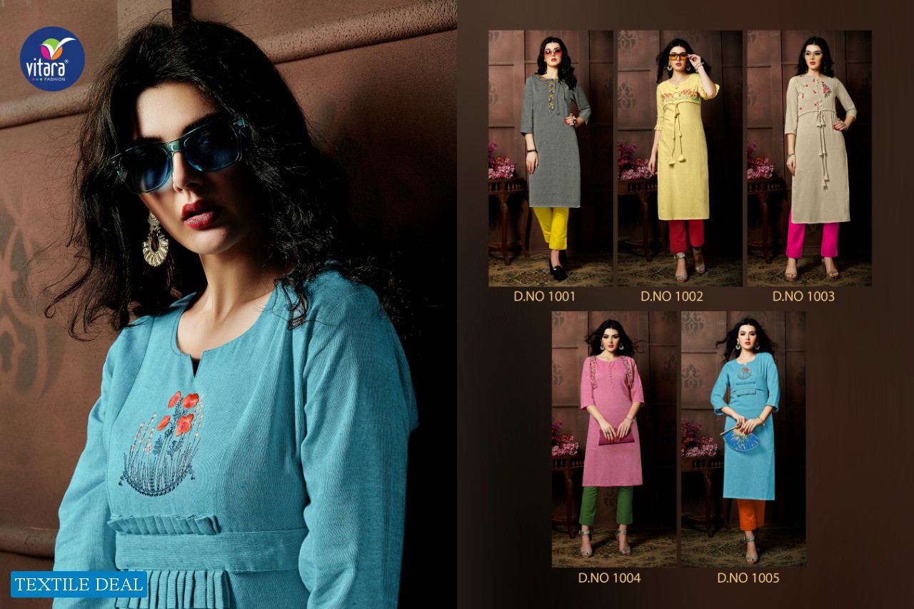 | Other Details: | ? vitara fashion launches exclusive designer kurti ? ?Catalogue name- SIMRAN ?Fabric- khadi handloom ?Size – M -38 ,L-40,XL-42,xxl-44 ☣Designs- 5 ?Rate:- 425/- GST +5% ADD ON BILL AMT |
