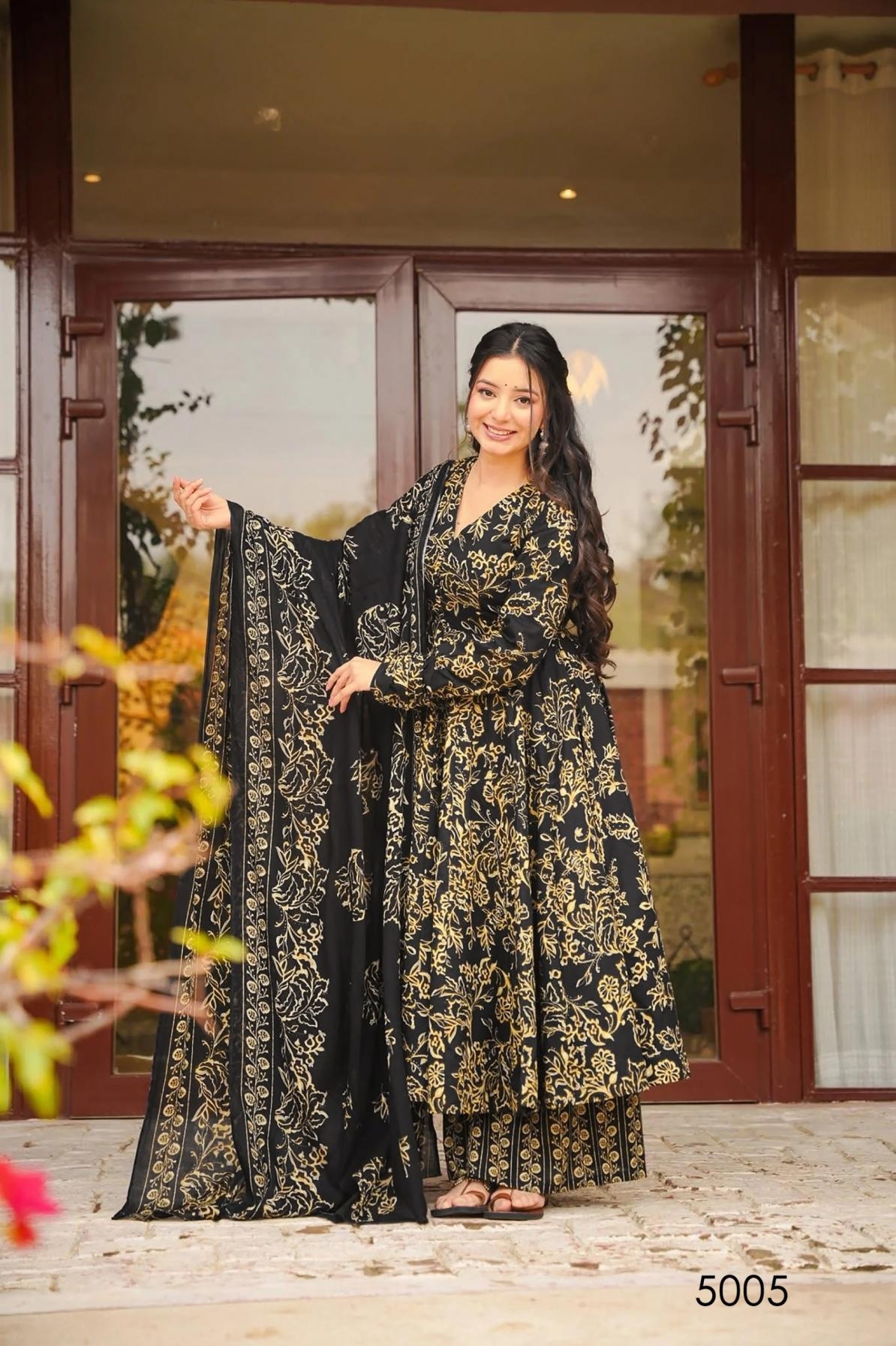 | Other Details: | Vyoma vol 5 Presents this Designer 3pcs beautiful printed Kurti ,bottom with dupatta Collection (set of 6 beautiful design 5001 to 5006) Product details Kurta fabric : - Maslin with heavy digital print Note:- sleeves fabric attached with sleeveless design ( design no-5001&5003) Bottom fabric: – Muslin with heavy digital printed Dupatta fabric :- Muslin with heavy digital printed Dupatta length - 2.5 mtr approx Work :– Heavy Digital Printed Size :- XS(34),S(36),M(38),L(40),XL(42),XXL(44),3XL(46),4XL(48),5XL(50),6XL(52) Stitched type:- Full stitched Style :- Festival Wear, Function, Ceremonial, Wedding Wear, Party Wear Rate – 1299/- Disclaimer: Colour Of The Garment May Differ From The Picture By 10-12% |