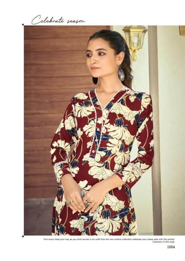| Name: | Woodee Shakira Vol 3 Series 1001-1006 Premium Heavy Rayon Kurti With Bottom | |