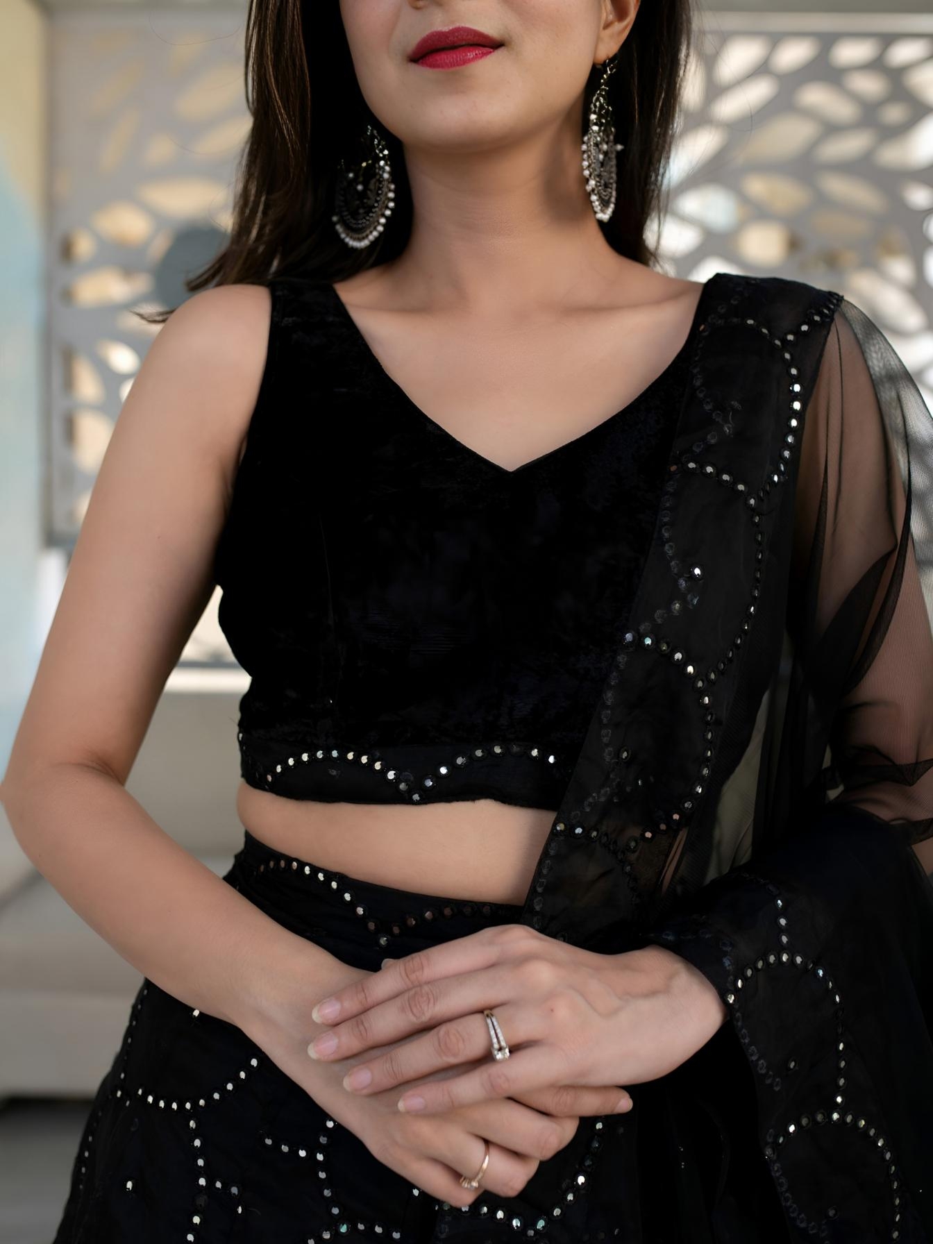 This black lehenga set blends modern elegance with subtle shimmer through its sequin detailing 🖤✨. Perfectly paired with a sleek blouse and sheer dupatta, it creates a graceful and stylish festive look.
