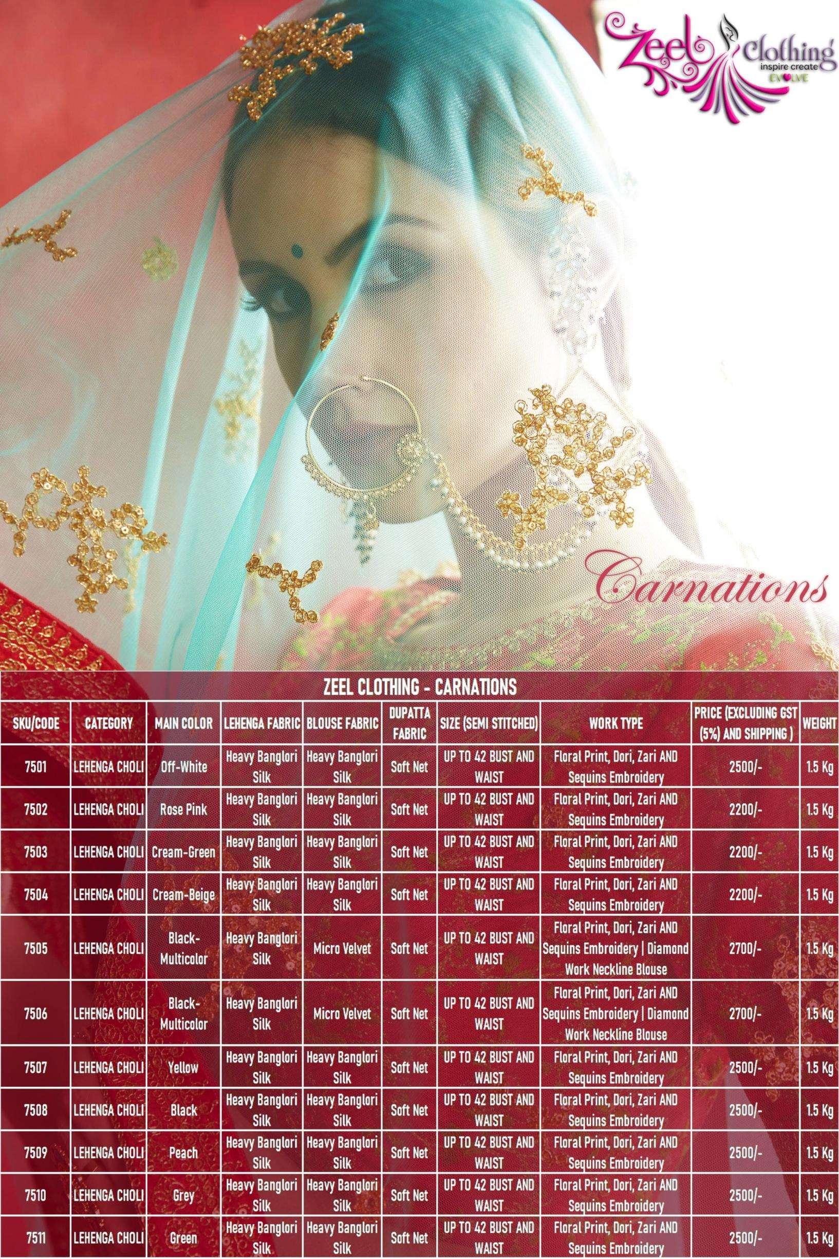 | Name: | Zeel Clothing Carnations Vol 1 Series 7501 To 7511 Occasion Wear Bangolri Silk Lehengas In Wholesale Surat |